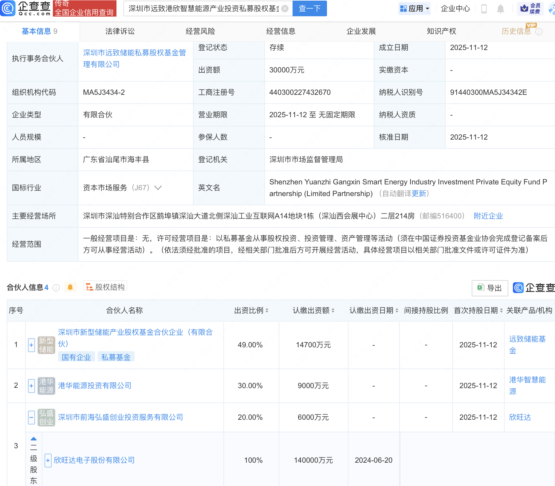 近日,深圳市远致港欣智慧能源产业投资私募股权基金合伙企业(有限合伙)成立,出资额3亿元,经营范围包含:以私募基金从事股权投资、投资管理、资产管理等活动。企查查股权穿透显示,该企业由欣旺达(300207)全资子公司深圳市前海弘盛创业投资服务有限公司、深圳市新型储能产业股权基金合伙企业(有限合伙)等共同出资。