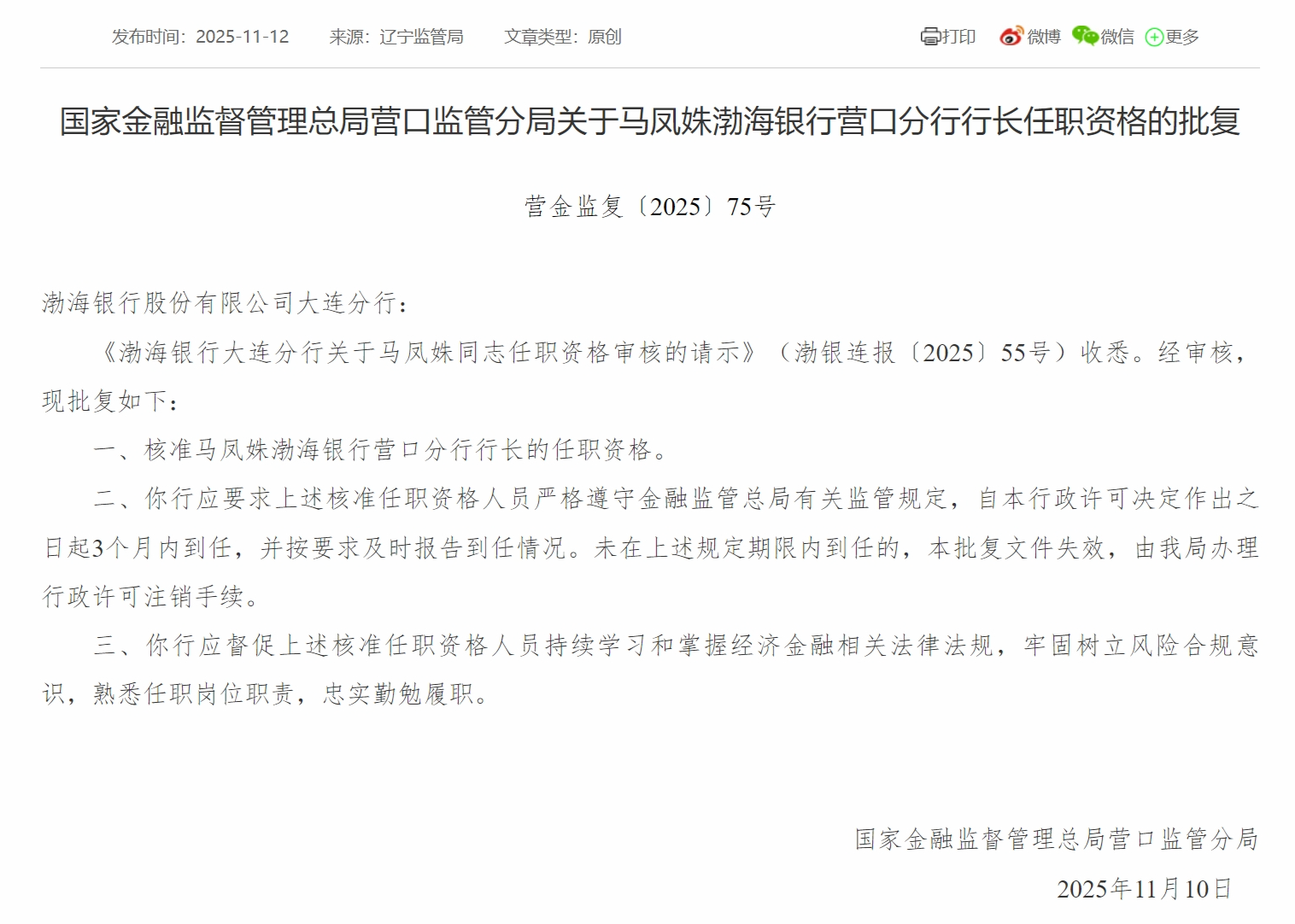 11月12日,国家金融监督管理总局营口监管分局发布关于马凤姝渤海银行营口分行行长任职资格的批复,核准马凤姝渤海银行营口分行行长的任职资格。